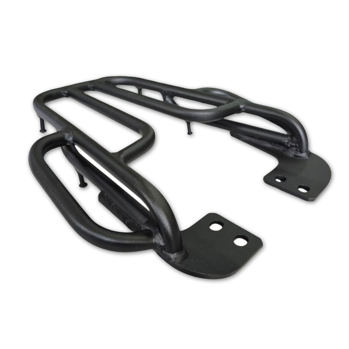 Bagageiro reforçado desenvolvido em aço carbono com afastamento do banco para baú e alças laterais para apoio do passageiro.